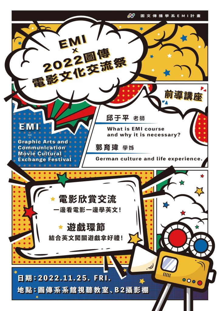 2022.11.25(Fri.)科工學院圖文傳播系舉辦「EMI X 2022圖傳電影文化交流祭」,歡迎師生踴躍報名參與! 時間:11/25(五)地點:圖傳系系館視聽教室、B2攝影棚聯絡人: 鄭宣芸連絡電話: 7749-3599電子郵件: 41072025h@gapps.ntnu.edu.tw Post author:OBE Post published:2022-11-23