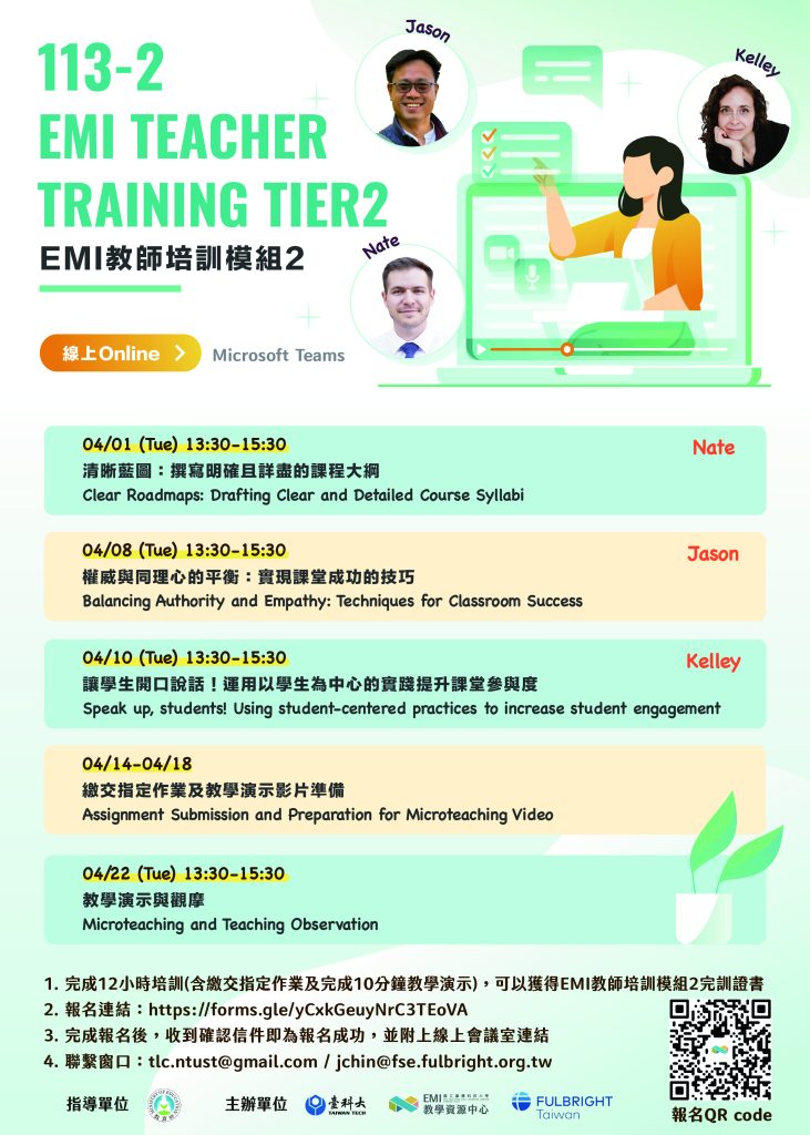 國立臺灣科技大學EMI教學資源中心(以下簡稱本中心)配合2030雙語政策及大專校校院推動EMI課程,於本(113)年正式成立。結合技職院校與一般大學之實務教學特色,並提供各大專校院教學之資源,此次與Fulbright Taiwan學術交流基金會EMI顧問團隊,聯手舉辦EMI教師培訓活動,以推動各大專校院EMI教師教學知能培訓,期望達到EMI教師教學增能之目的,並透過資源中心資源共享,合作共好之理念。