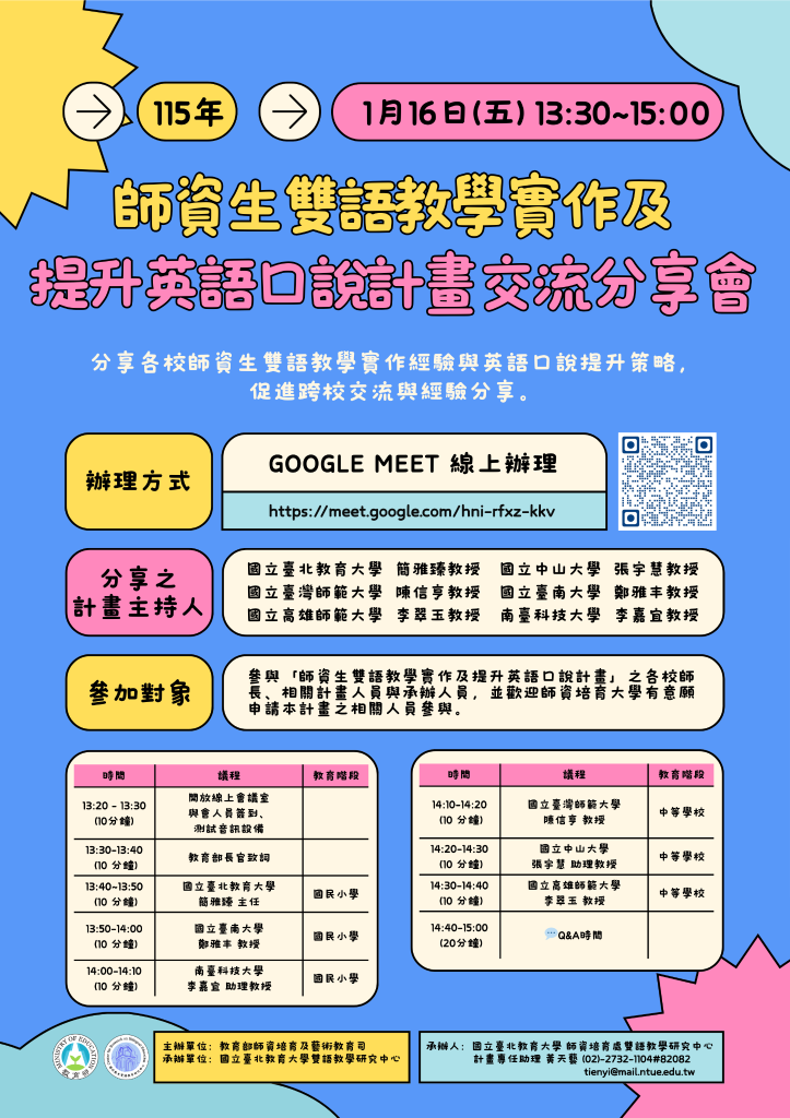 由教育部師資培育及藝術教育司委託國北教大雙語教學研究中心承辦,相關活動資訊說明如下: