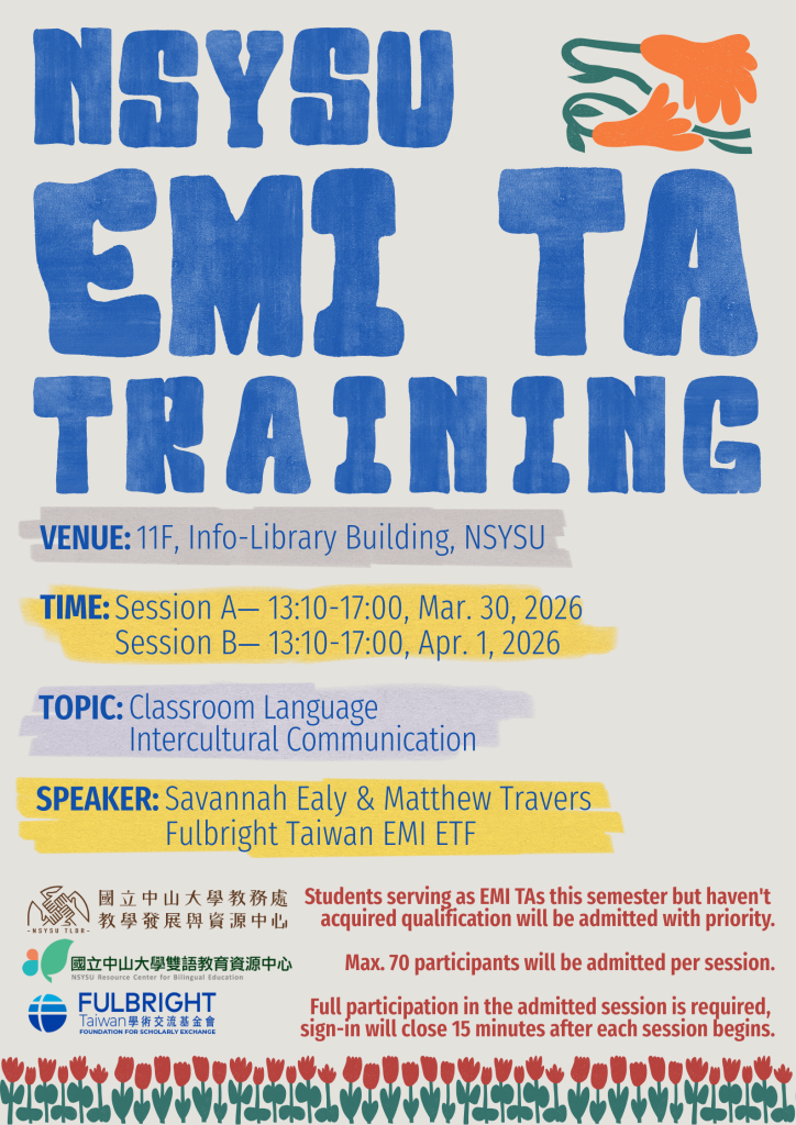 為提升EMI課程學生學習成效及教學助理知能,國立中山大學雙語教育資源中心特辦理EMI教學助理培訓,邀請學術交流基金會(Foundation for Scholarly Exchange,FSE)教學人員講授「課室語言(含發音)」與「跨文化溝通」兩門課程。