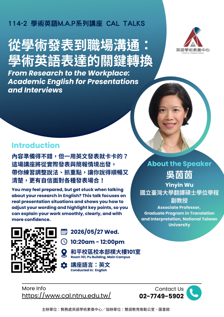 本場講座將從實際的發表與簡報情境出發,由吳茵茵老師將帶領你跨越學術與職場的鴻溝!