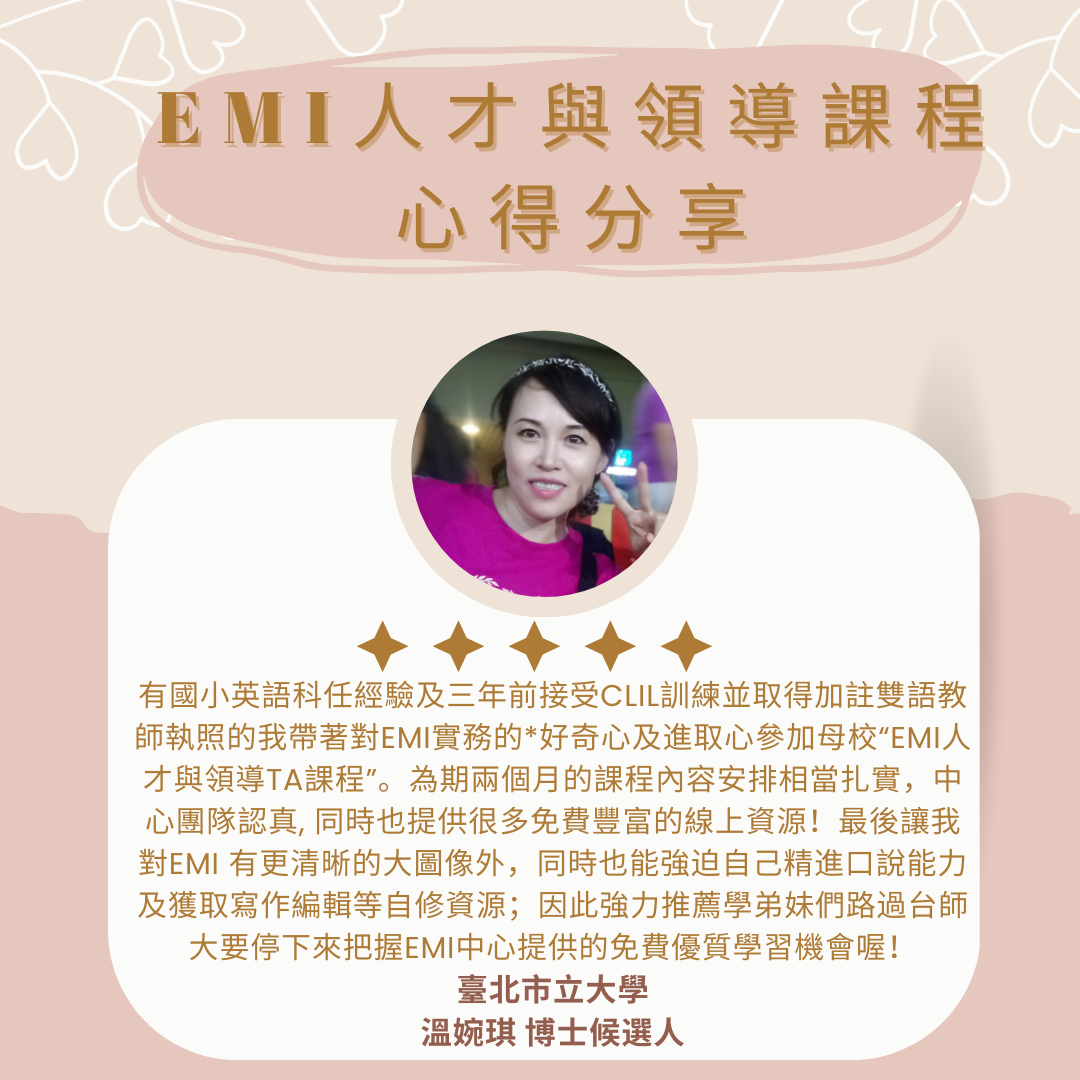國立臺灣師範大學EMI教學資源中心(以下簡稱本中心)為因應各大專院校積極擴展EMI課程的開設而增加的EMI課程教學助理需求,辦理學術英語人才與領導課程(The EMI TA Talent and Leadership Course),透過「EMI基本能力培訓課程」與「學術英語輔導員培訓課程」課程,以同步與非同步線上學習之方式,使學員能不受地理位置限制,學習EMI教學助理的教學專業知能。